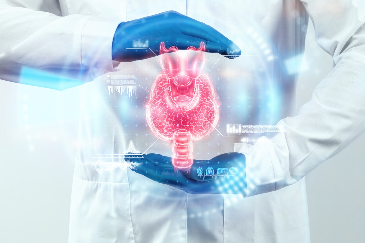 The thyroid is a tiny, butterfly-shaped gland which is in front of your windpipe. It produces and releases the hormones that help your body